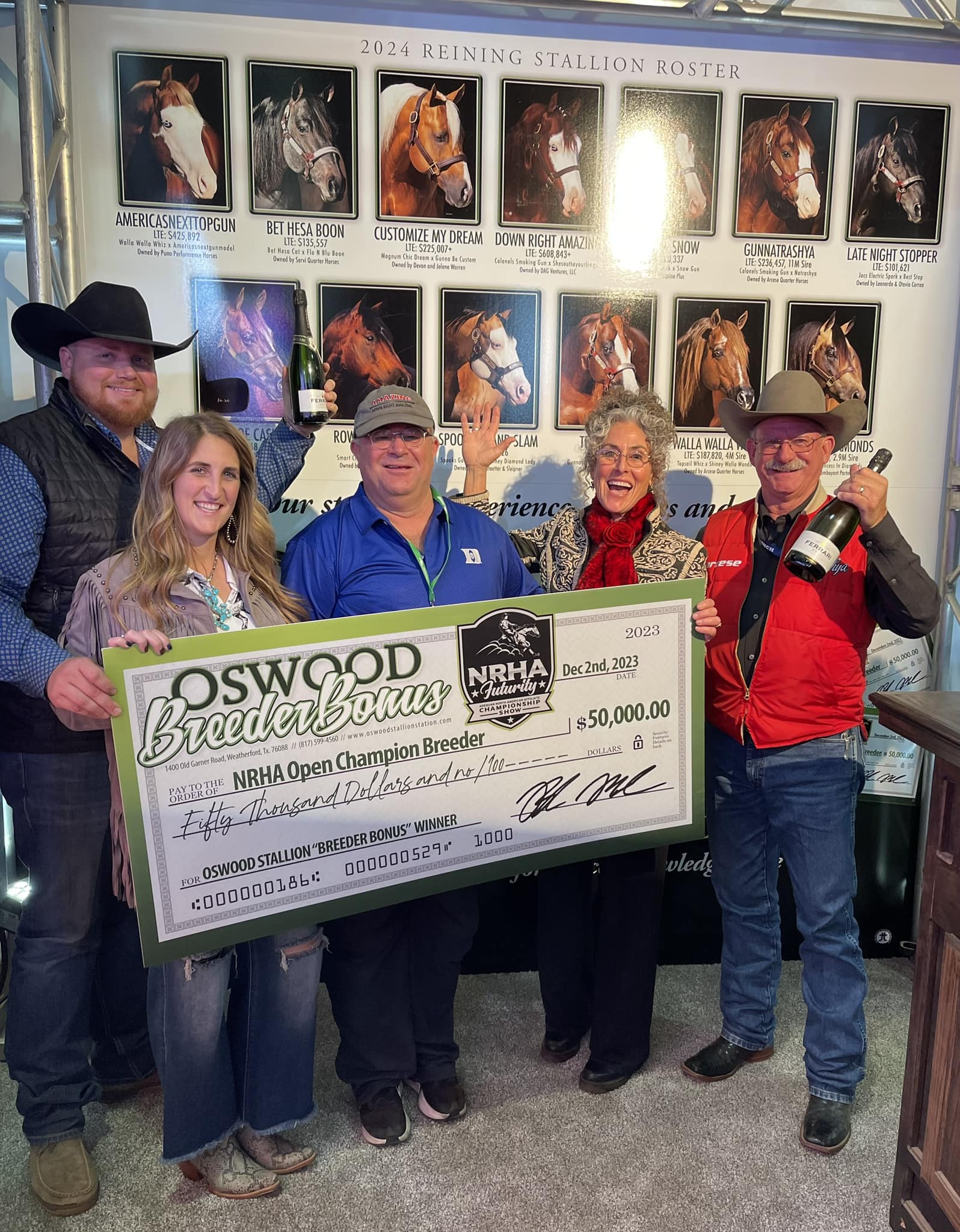 Here’s how it works: the breeders of any Open or Non Pro Futurity Champion* sired by a current Oswood Sire will receive a generous check for $50,000. directly from Oswood Stallion Station. But that’s not all! We are thrilled to announce that some of our outstanding stallion owners have decided to match these payouts, resulting in potential checks of up to $100,000. for the lucky breeders.